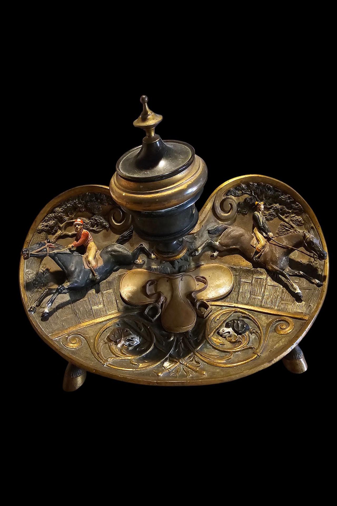 A remarkable piece of sporting art, finely painted with racehorses and jockeys, a saddle, and two hounds—each detail beautifully rendered with the grace and motion of the era. From an important Virginia estate, this inkwell reflects superb Art Nouveau design and craftsmanship. A distinguished and rare find for the serious collector. 9.5" W × 6.5" H × 5.5" D Please call for details.