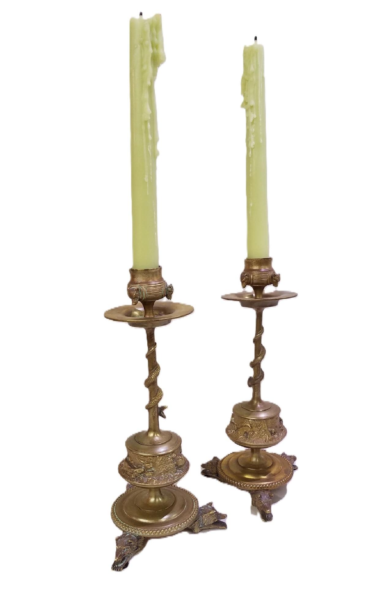 Pair of bronze fox gilt candlesticks