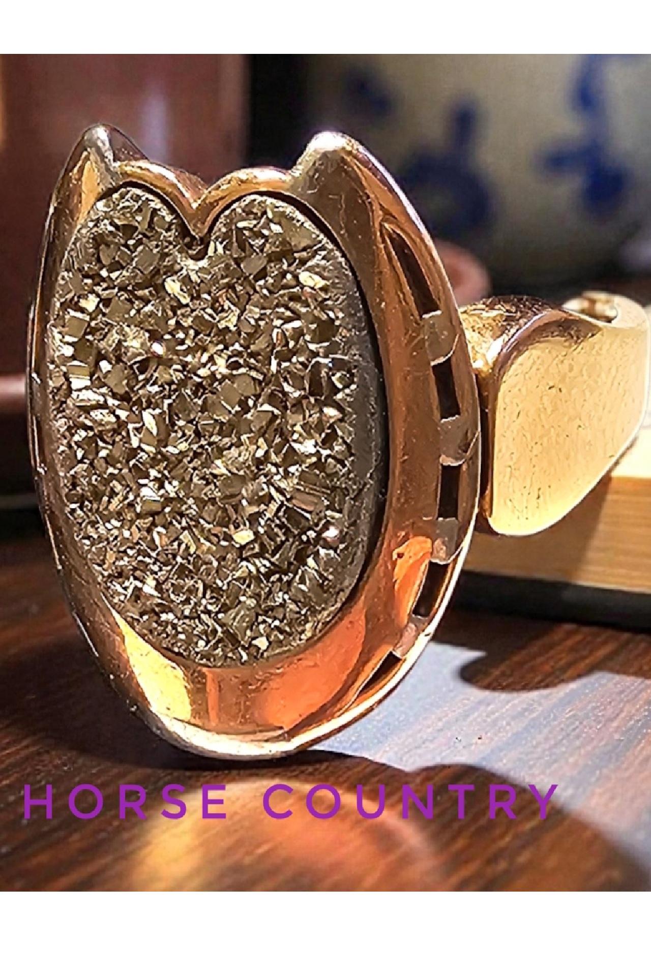 14k gold with Pyrite. Sides reminiscent of horse shoe nails