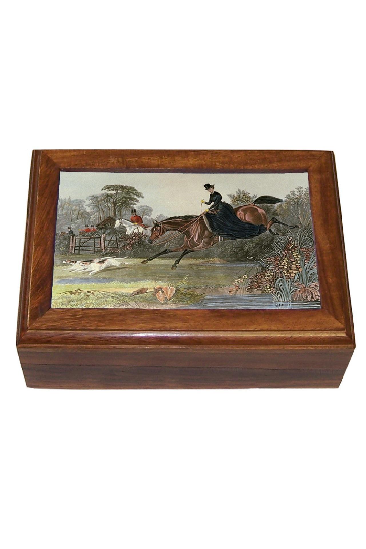 Accented with print of "Sidesaddle Lady Jumps" behind glass